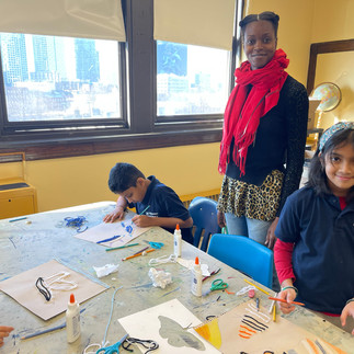 Each class had begun working with yarn and glue last week to bring color and texture to their animal silhouettes, so they were ready to jump right in this week. With a quick refresher of the term "mixed media," students now had the option to add patterns or details in colored pencil alongside the yarn. All three classes were focused, productive, and conscientious of sharing supplies and asking politely for help when they needed it. Time flies, so we advised students how best to achieve a finished piece by the end of next week's class. We have heard lots of appreciative comments from students about this project and are very glad they're having fun!