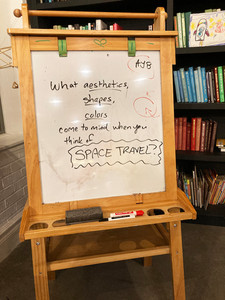 We looked at paintings by Hortensia Mi Kafchin, whose exhibition Paintings Made for Aliens Above at P.P.O.W. Gallery partly inspired this lesson, as well as Rene Magritte and Georgia O’Keeffe. Then, we passed around images of real-life spacecraft such as the space shuttle, the International Space Station, a lunar lander, and fictional spaceships from Star Wars, Star Trek, 2001: A Space Odyssey, and Alien. Participants thought of more and more space movie references as the discussion went on.