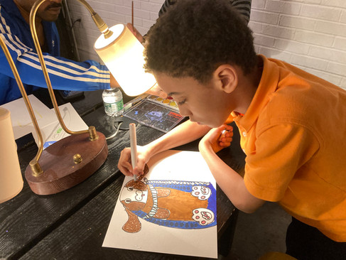Managing Director Dennis Buonagura writes from the Path Train: “In the final class of Teaching Artist Nick Tardiff's terrific lesson on migrating animals in motion, students at our partnership school in Jersey City, PS 6, finalized their pieces by adding backgrounds to their penguin, wildebeest, and dolphin pieces.