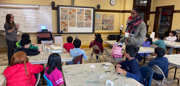 This exciting week at AYB began with celebrating MLK Day on Advanced Studio on zoom with Fatima as we focused on exploring migration and metanoia— the changing of one’s mind and how movement can lead to change. In person on Tuesday we enjoyed looking at art in person with a trip to see Voice of Space: UFOs and Paranormal Phenomena at The Drawing Center lead by Evelyn. Today Dennis, Evelyn, and Simone were back at ART YARD Art Matters at PS 6 to continue our animal migration mixed media art making.