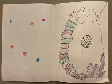 Fatima brought her signature colorful portrait style to several pages of interpretations of Walter Pichler’s drawing Loch im Kopf (1985), including a delightfully ghostly marker bleed-through on a subsequent page.