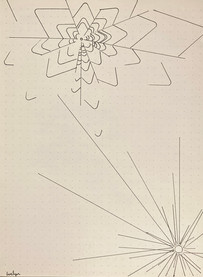 My (Evelyn’s) series of pen drawings on dot paper and drawing paper was inspired by Shusaka Arakawa’s Study for Moral/Volumes/Verbing/ The /Unmind (1977), a mesmerizing composition of conical forms and radiating lines; I used a plastic straightedge and curving stencils, considering the idea of transmissions sent into space that are not received by distant planets. We drew comparisons between Bob’s delicate, organic line drawings (some on white drawing paper, another on a collage of white, black, and translucent tracing paper) and the drawings by Donnelly we had seen upstairs.