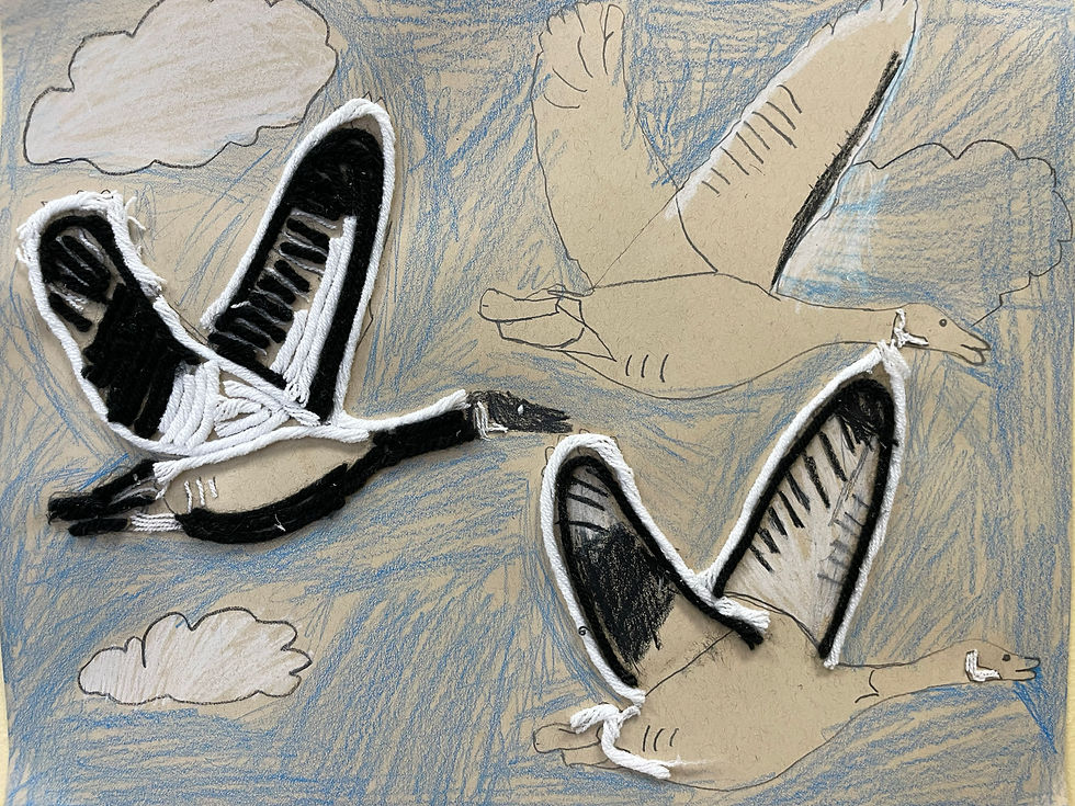 During critique, students drew comparisons between peers who depicted the same number of animals or used a similar technique to depict fluffy clouds; pointed out contrasts between artworks showing the same animal in different media; and gave thoughtful, specific compliments on scenery choices, color contrasts, and level of detail. Dennis and I complimented each class on their focused attention to the project. Many students finished their work, and others’ remain works-in-progress for now, with a standing offer to the classroom teachers to let their students borrow supplies and keep going. Our most meticulous workers, who focused on rendering only the animal with densely packed yarn, may have the option to crop their work for exhibition. We can’t wait to see these migrating animals making their way across the gallery walls!