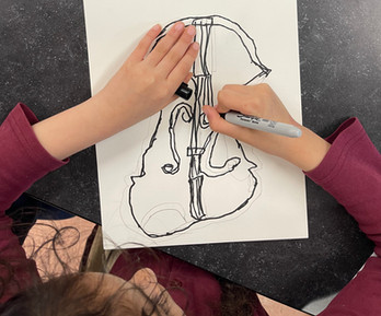 Grades 1 and 2 started our new project: The Shape of Music. This lesson is inspired by the AYB Advanced Studio mural “Resonating Chamber,” which explored how sound and space interact by using the shapes of musical instruments. With a selection of musical instruments familiar to the students—trumpet, flute, violin, and piano—we learned how to simplify shapes into contour drawings based on printed reference images. Students completed their line drawings in pencil and Sharpie and are ready to move on to the next stage.
