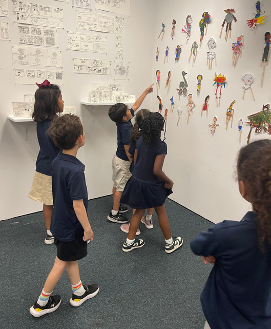 Dennis reports: “On Thursday, Leo, Evelyn, Litzy and I (Dennis) finished up the installation at PS 6 and tidied up the gallery for Friday's docent training. Litzy worked further on the comic project while Evelyn spearheaded the installation of the illuminated letters pieces - and Leo tweaked the puppet display and also reached lots of the high spots for all of us. We also filled the portfolios and picked up many fallen tacks.