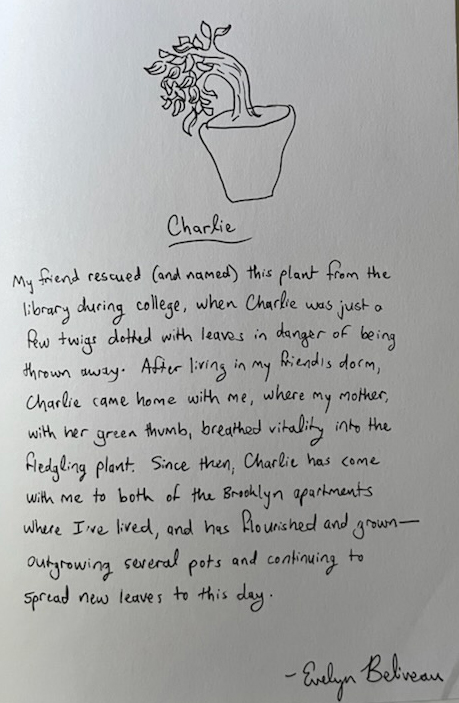 During critique, everyone shared the stories behind the objects they created. Many of these objects that people moved with serve as reminders of formative times in our lives, or relationships we have with others. Evelyn made a replica of a plant that they got from their college's art department that their mom revived for them.
