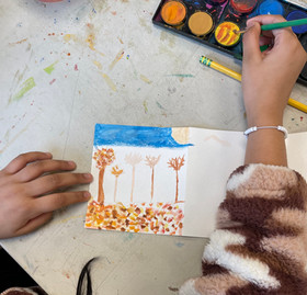 They brainstormed their own experiences of the different seasons--moods, activities, colors and sights--and began sketching or painting the pages of their accordion books. Students were engaged and chose various methods to capture the seasons. Some went abstract, while others drew beautiful trees and flowers. Many students, who jumped right into watercolors on day 1, learned valuable lessons about the optimal amount of water to use and the importance of letting colors dry completely. I'm excited to see their projects develop in the next two sessions!”