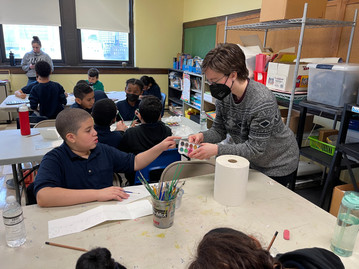 Dennis and Teaching Artist Evelyn Beliveau (assisted by Sarah Gumgumji) are back at our partnership school in Jersey City, PS 6, with a lesson called Accordion Books of the Four Seasons. Sarah cut and folded dozens of large watercolor paper into accordion books while Evelyn showed a presentation of various ways to depict the four seasons in art - personification and abstraction being two of them.