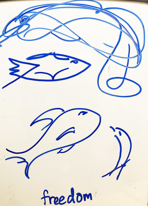 Dennis recounts: “The presentation was sent earlier in the week to each classroom teacher who generously took the time to show it to their students - a great luxury for us to have students arrive in class with ideas already swimming in their heads. Evelyn gave the students the option to begin with pencil or jump right into painting.
