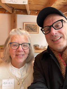 AYB Managing Director Dennis Buonagura writes: “I went downtown to artist Maira Kalman's holiday pop-up shop in Tribeca - fun, lots of handmade items by Maira for sale (posters, needlepoint/embroidery pouches, napkins, table-runners, etc). But, lucky me, I got to chat with Maira and her son Alex (artist, and founder of Mmuseumm) - our conversation was not about art (well, not really) but about the celery stalk Maira noticed in my tote bag (an ART YARD BKLYN tote bag, mind you). I'd stopped at Gourmet Garage before going up to the pop-up and bought celery, carrots, and mushrooms for soup. The celery was sticking out of the top of the bag. Maira asked if I followed a recipe or was it a family secret - but I told her I add ingredients as I go along and had no set recipe. That topic morphed into recipes for pot pies - Maira asked if I made one large pie or several little ones - she likes to make the one big pie! I felt weird to ask a photo but she was very happy to oblige - so much so that she directed me in holding the camera higher for a better shot.
