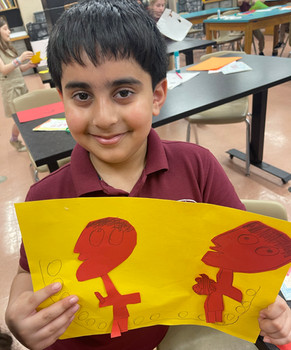 Last time, students had the choice to trace stencils or create their own drawings of musicians to cut out; now, they retrieved their cutouts from the envelopes we’d stored them in and used glue sticks to layer them onto sheets of brightly colored paper. We encouraged students to experiment with overlapping figures and musical instruments. Many students were eager to trace and cut out more shapes after they’d glued down their first round. They will finish bringing their projects to life with acrylic paint markers next week.