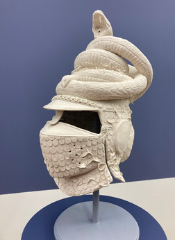 The promotional materials expound: “The show pairs medieval-style banners hung on the wall, inspired by the Metropolitan Museum of Art’s armory collection, and invented helmets made of papier mâché and paper clay. The artist works within the history of Western European decorative arts with its hyper-feminine association, to re-imagine the chivalrous, performative function of these highly embellished artifacts of military glory. Her delicate sculptures, ever more baroque yet equally preposterous, are in turn utterly useless to protect or even intimidate. The overall exhibition can be read as both an admiring re-engagement with seemingly antiquated decorative traditions, and an excoriation: the ludicrousness of glamorizing the savagery of war and empire building.”