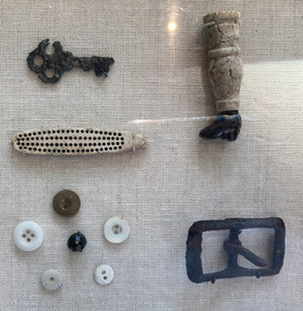 Museum installation views of Pequot Villiage diorama, stone carving, artifacts with a tiny right leg from a porcelain doll and a lego miniature structure by a student. Photos Meridith McNeal.